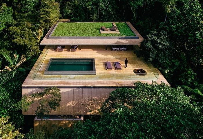 Дом построен из облицовочного бетона и натуральной древесины. Благодаря современному и лаконичному дизайну, эти простые материалы прекрасно вписались в окружающие джунгли. К тому же крыша дома покрыта зеленым настилом. Он, кроме эстетических функций, выполняет еще и практическую роль – защищает дом от чрезмерного перегрева.