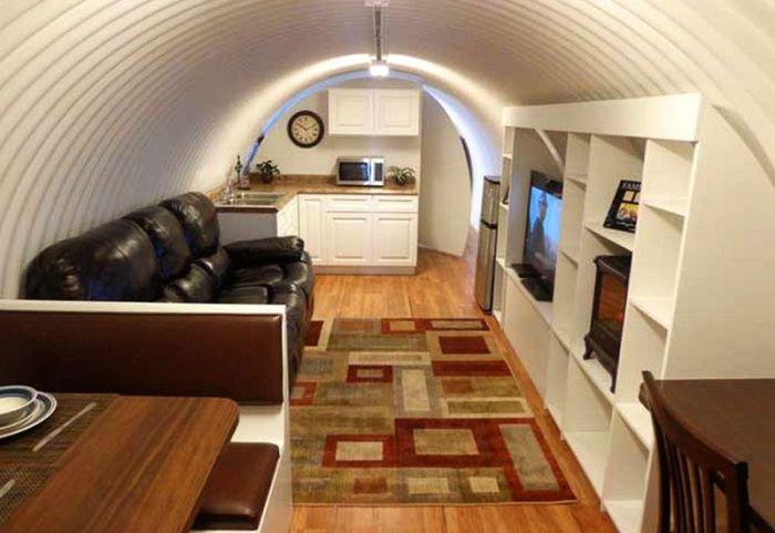Внутри бункер выглядит как обычное комфортное жилище. Там можно увидеть гостиную, комнату с двухспальной кроватью, детскую с двухъярусными кроватями, кухню, санузел и помещения для хранения вещей.