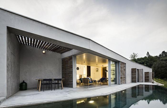 Лиссабонская архитектурная студия Camarim Arquitectos разработала двухуровневый загородный дом. Приступая к разработке проекта, дизайнеры стремились вписать будущий дом в сельский пейзаж и позаимствовать элементы традиционной архитектуры региона. Часть дома, которая выходит на улицу, облицована сланцевым камнем. Все остальное выполнено из бетона.