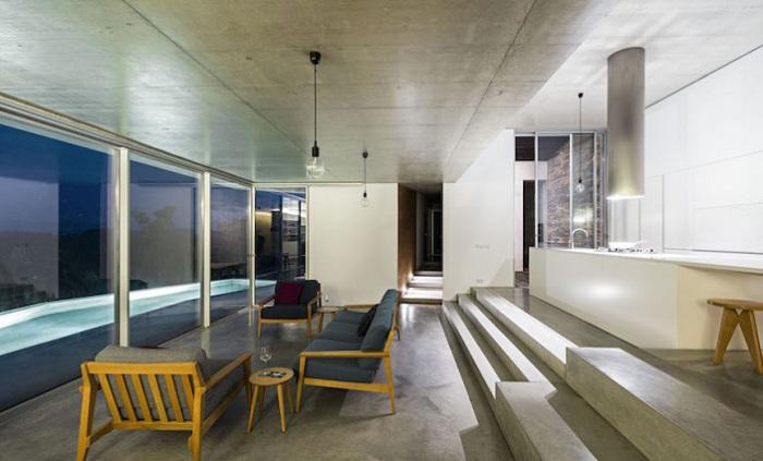 Вторя холмистой местности, дом спускается по склону зигзагами. Сверху находятся гараж и спальные комнаты. Ниже расположены гостиная, кухня и столовая. Каждое пространство имеет свой выход наружу. В гостиной установлены огромные раздвижные стеклянные двери, открывающие вид на живописный пейзаж. Если хозяевам захочется укрыться от случайных взглядов прохожих или чрезмерного солнца, снаружи находятся деревянные ставни.