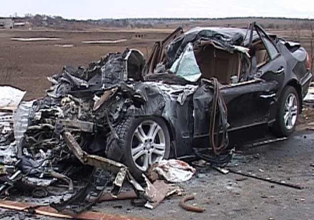 Лишь чудом водитель Мерседеса выжил в этом железном месиве – медики «скорой» забрали его с серьезными травмами.