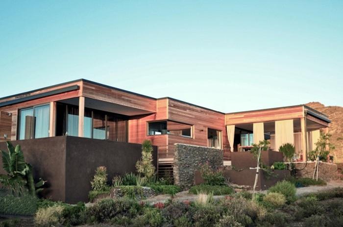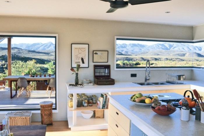 В модульном особняке расположены гостиная с открытой планировкой, кухня со столовой и две спальни. Для обогрева помещения холодными ночами в доме используется камин. Питьевой водой хозяев обеспечивает близлежащий источник. Система сбора дождевой воды перерабатывает жидкость, которая затем используется для орошения небольшого огорода вблизи дома.