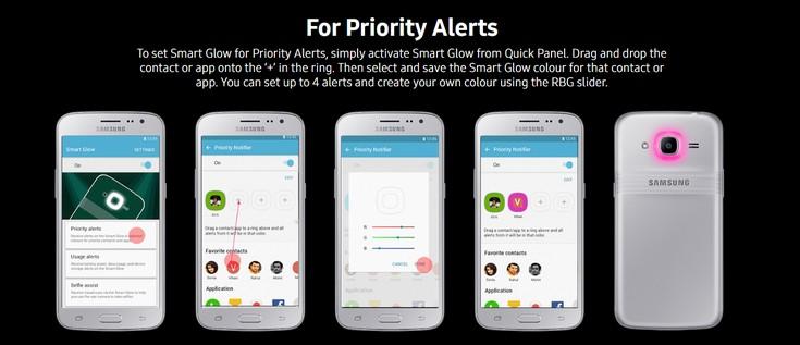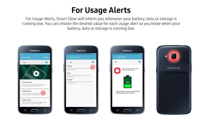 Вокруг модуля основной камеры Galaxy J2 расположено кольцо системы Smart Glow, которое может светиться различными цветами, сигнализируя о системных событиях (пропущенных звонках, уведомлениях и сообщениях). Также это кольцо задействовано в функции Selfie Assist. Когда пользователь будет пытаться сделать селфи, вращая смартфон в вытянутой руке, кольцо Smart Glow загорится в том случае, когда лицо пользователя полностью попало в кадр.