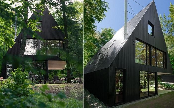 Темный фасад словно маскирует жилище в лесной чаще. Прозрачные окна от пола до потолка скрыты под большим навесом, который является продолжением крыши.