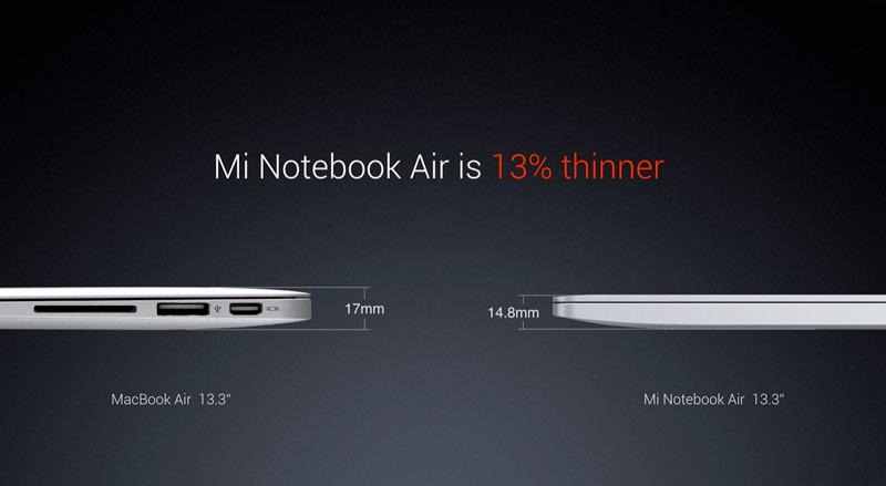 В ходе презентации Xiaomi несколько раз сравнивала Mi Notebook Air с MacBook Air. Так, в компании отметили, что при той же диагонали экрана 13,3-дюймовый ноутбук Xiaomi на 11% компактнее и на 13% тоньше (14,8 мм против 17 мм) конкурента.