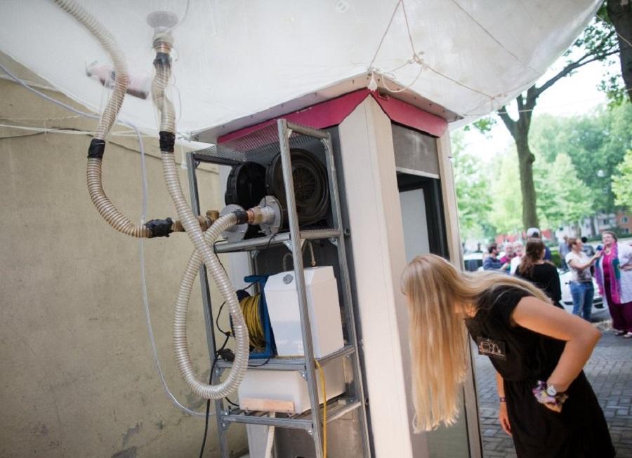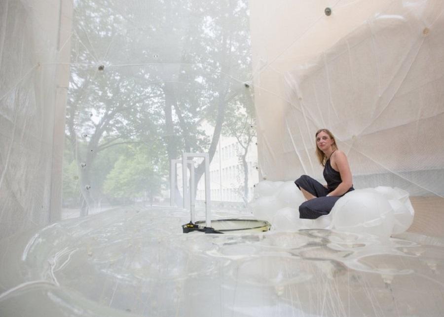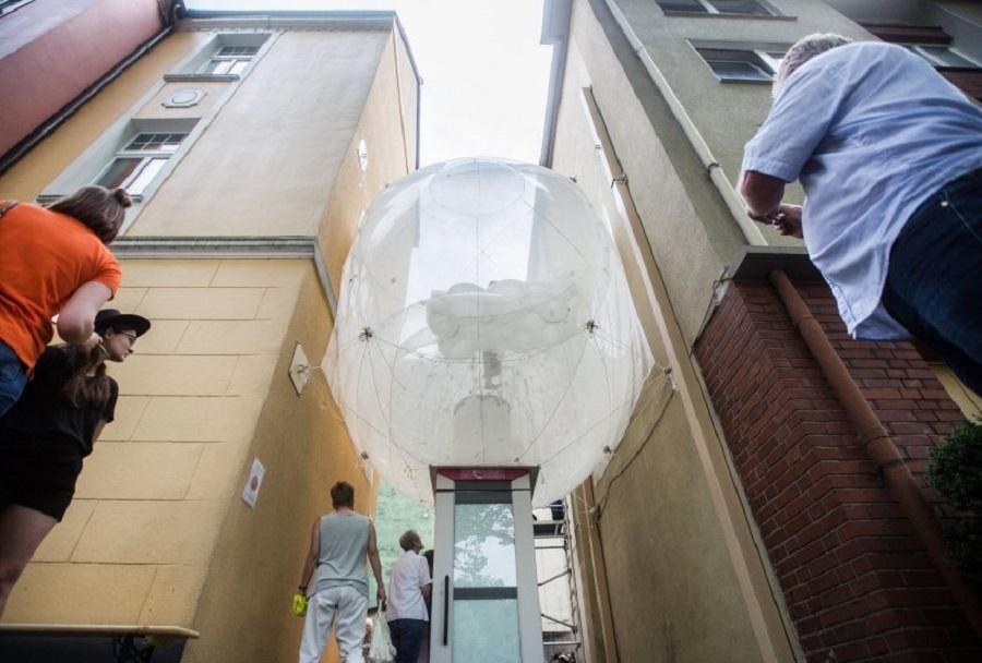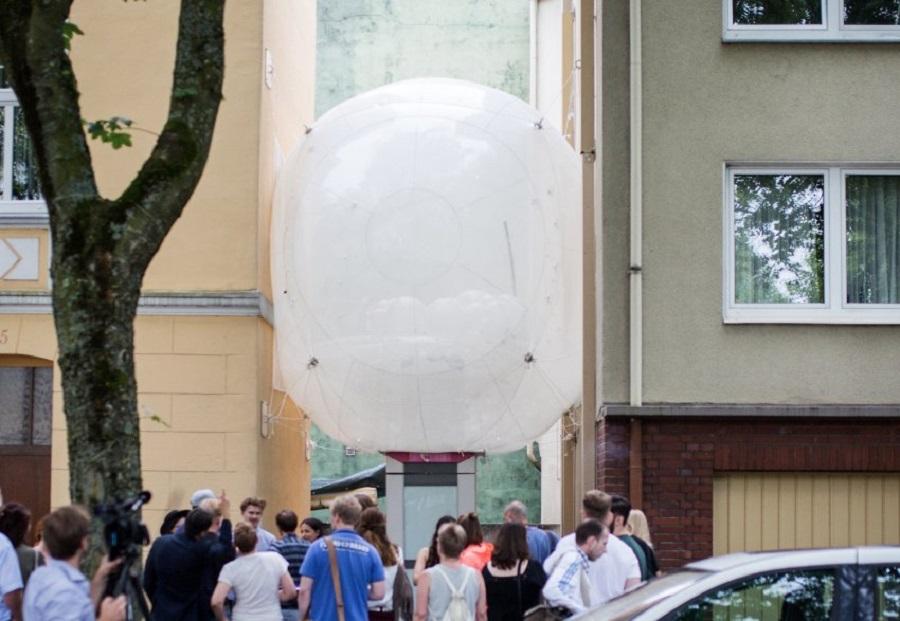 Старая телефонная будка — это одновременно вход, лестничная клетка и ванная. Пузырь размером около 50 куб. м состоит из пластика. У него светопроницаемые стены и пол, напоминающий батут. «Он не такой твердый, как бетонный пол, — объясняет студент Александр Раков, — но он выдерживает одного человека и по нему приятно ходить». Насос нагнетает внутрь свежий воздух.