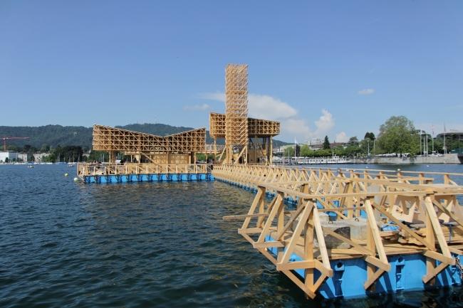 Программу павильона – бассейн, бар, терраса для загара и кинотеатр со ступенями-сидениями – изначально сформулировал куратор международного смотра этого года Кристиан Янковски. А авторами временной конструкции, получившей название «Павильон размышлений», выступили 30 студентов Федеральной высшей технической школы Цюриха (ETH). Руководили работой, занявшей около 10 месяцев, их преподаватели из учебной студии Тома Эмерсона. По итогам внутреннего творческого конкурса были определены самые интересные идеи, которые уже совместными усилиями превратили в реализованный объект. Для многих студентов это был первый подобный опыт. Деревянная конструкция собиралась также силами самих же студентов в одном из ангаров на другом берегу озера, а потом по воде была доставлена на место.