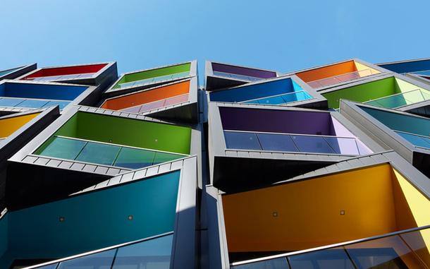 Здание состоит из нескольких “слоев”-этажей, что символизирует многосоставный культурный контекст местности, в которой оно находится. Каждый уровень имеет зигзагообразные края, и чередование их выступов и углублений создает выраженную динамику. Геометрия фасадов подчеркнута яркими красками в отделке балконов.
