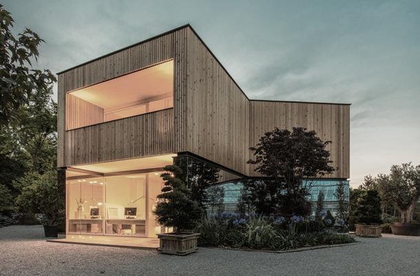 Фасады здания наполовину отделаны зеркалами, которые создают тесную связь архитектуры с природой, отражая зелень на уровне глаз. В результате создается ощущение, что верхний этаж словно парит в воздухе.