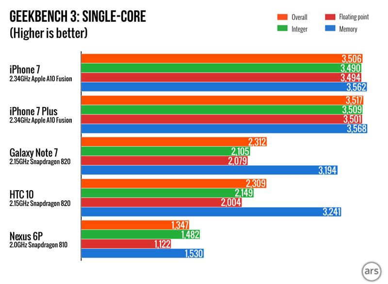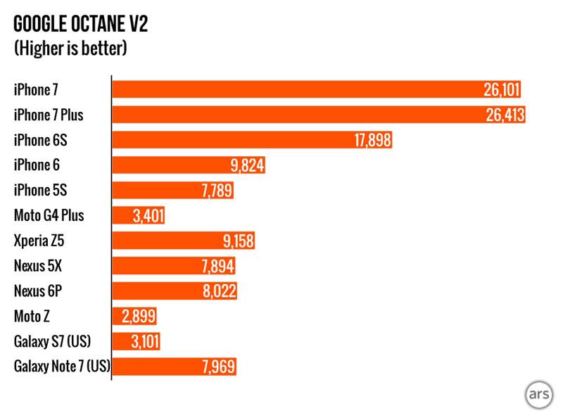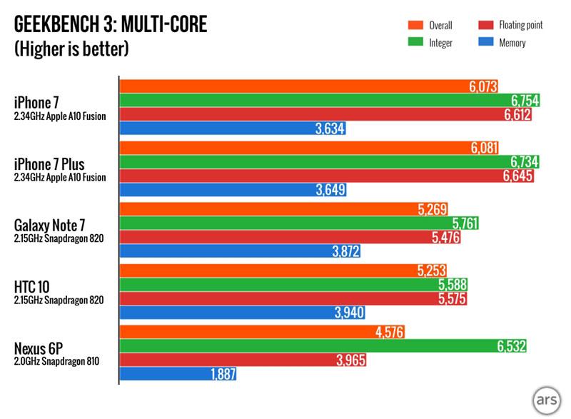 Если сравнивать достижения нового флагмана Apple с топовыми смартфонами на Android, то у последних попросту нет никаких шансов. Так, ближайший преследователь Samsung Galaxy Note 7 набрал всего 2312 баллов в одноядерном тесте и 5269 – в многоядерном.