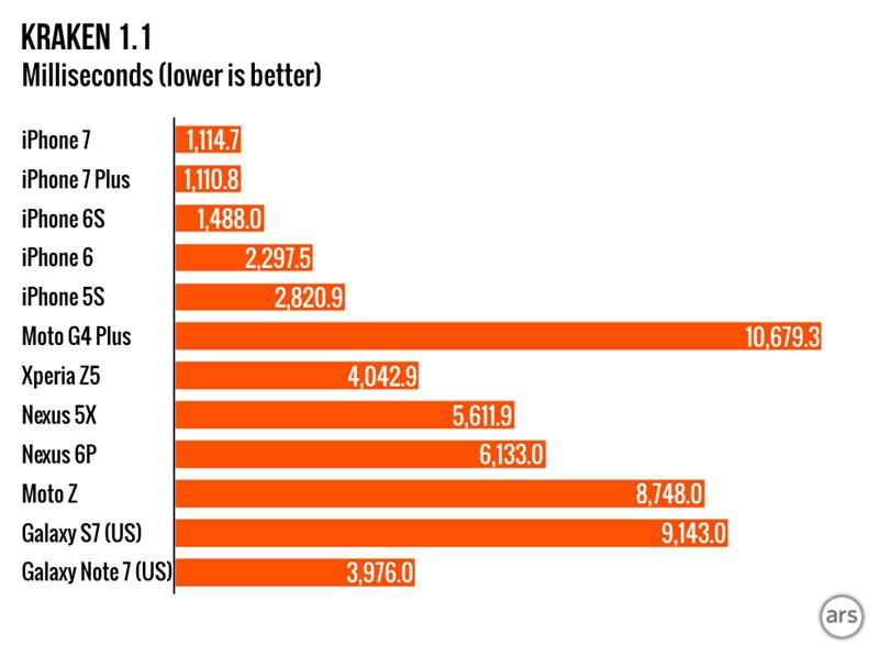 В бенчмарке Kraken, измеряющем скорость работы javascript (чем меньше, тем лучше), iPhone 7 Plus демонстрирует рекордный результат 1110,8 мс. Новый смартфон Apple оказался лидером и в тесте Google Octane (чем больше, тем лучше) – 26 413 мс.