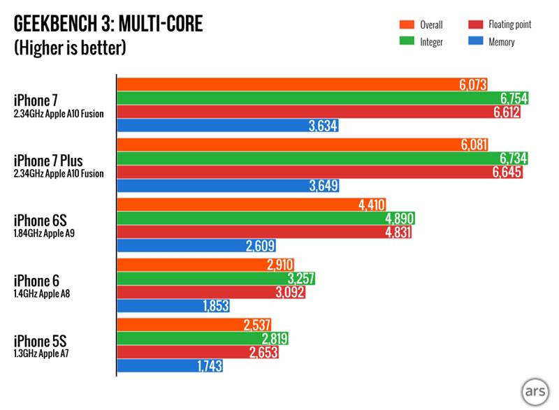 Результат iPhone 7 в тесте GeekBench с одним ядром составил 3506 баллов, с двумя – 6073 балла. По отношению к предыдущей модели прирост оказался внушительный: в том же бенчмарке iPhone 6s демонстрирует показатели 2537 и 4410 баллов соответственно; результаты его предшественника iPhone 6 – 1633 и 2910 баллов.