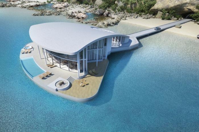С берегом « Sting Ray» будет стыковаться своим «хвостом». На платформе помимо дома оборудуют гараж для двух автомобилей, кострище, джакузи и бассейн.