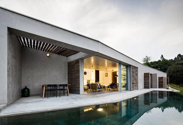 Верхняя стена, где расположен основной вход, отделана сланцем, что напоминает местные постройки. Дом имеет несколько уровней: его объем словно надрезан с двух сторон и растянут в соответствии с очертаниями рельефа. Это позволило не только вписать его в участок, но и создать границы между общественными и приватными комнатами, при этом на каждом уровне предусмотрен собственный выход наружу.
