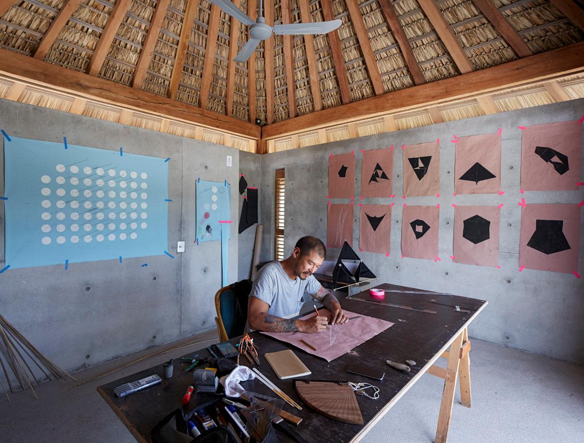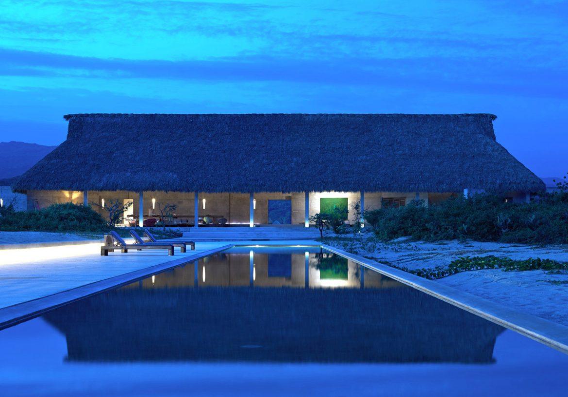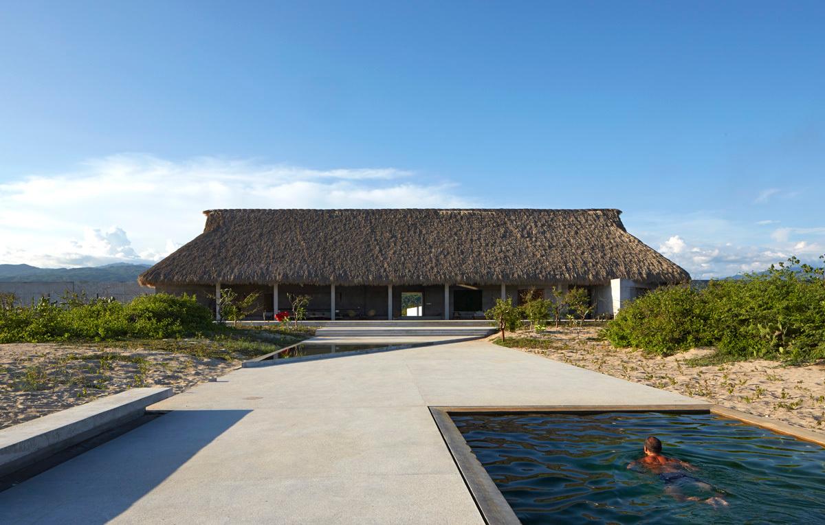Постройка из бетона и палапас — высушенных пальмовых листьев — вдохновлена японской концепцией «ваби», которая стремится находить красоту в несовершенствах, непостоянстве, случайностях и природе. Мебель из необработанного дерева и соломы, скульптурные объекты, кактусы — все это дополняет монументальную бетонную конструкцию. Такой дизайн идеально вписывается в окружающий равнинный ландшафт на берегу океана.