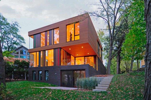 В этом американском частном доме необычно все: и формы здания, и цветовая гамма, и конструктивные решения, и даже тот факт, что кирпич не так часто применяют при проектировании современных экстерьеров домов .
