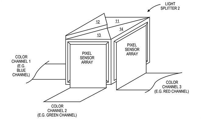 Патент Apple предполагает использовать призмы и три отдельных матрицы, как в камерах 3CCD. Разделение поступающего света на три потока (красный, зелёный и синий) позволяет повысить чувствительность 2–3 раза и добиться максимально точной попиксельной цветопередачи.