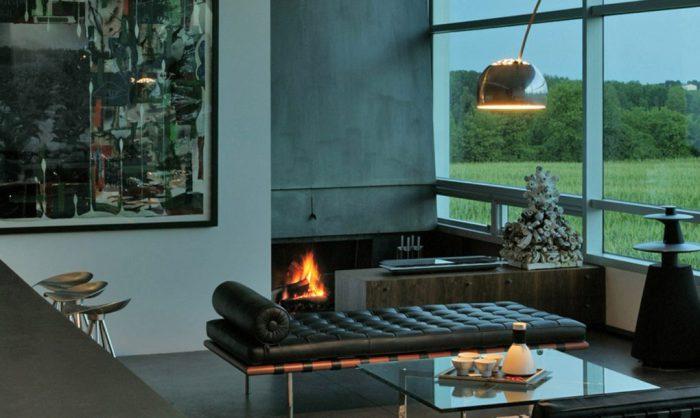 Дом имеет прямоугольную форму, он визуально разделен на две части. С одной стороны находятся кухня, столовая и гостиная, а с другой – спальни и ванные комнаты. Немаловажным элементом, придающим уют дома, является камин, дымоходы от которого видны снаружи. Широкие окна только усиливают связь с окружающим ландшафтом, а также позволяют естественному свету беспрепятственно проникать внутрь дома.