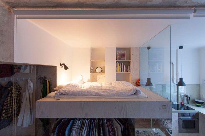 На половине этого пространства изобретательная девушка уместила кухню спальню и гардероб.