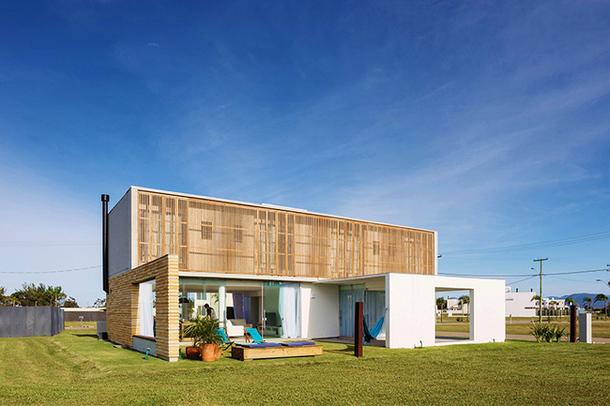 Структура состоит из двух крупных, поставленных друг на друга объемов. Первый этаж с большим количеством проемов и остекления обеспечил пространство для общения всей семьи, а также стал надежной поддержкой более массивного верхнего этажа со спальнями. Белые поверхности стен внизу сочетаются с открытыми неровными бетонными поверхностями наверху, а также со светлым камнем выступающей на участок стены и древесиной, из которой созданы дополнительные элементы.