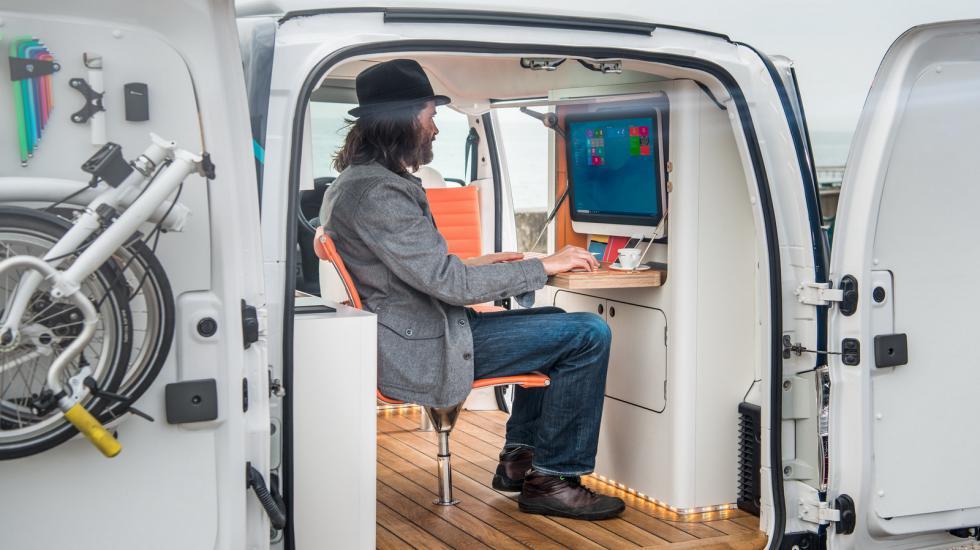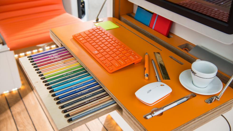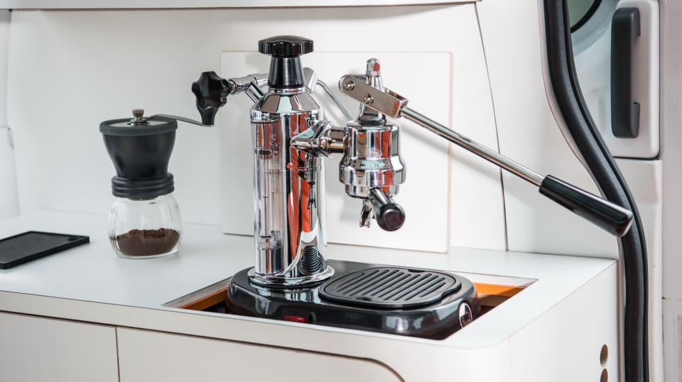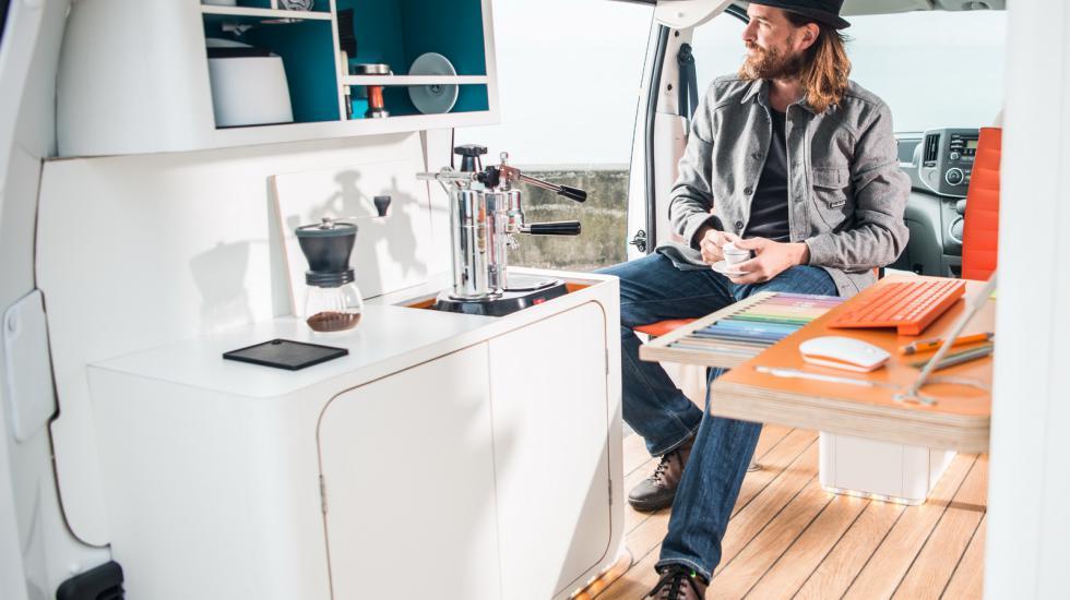 Собственно, под эти цели ушла вся грузовая часть фургона. Сразу за передними креслами расположились как воркспэйс, так и перекуситьспэйс. Тут есть компьютер и откидывающийся столик при нем, небольшой холодильник и хорошая кофемашина, уютные стулья и пара ящиков для еды-документов.