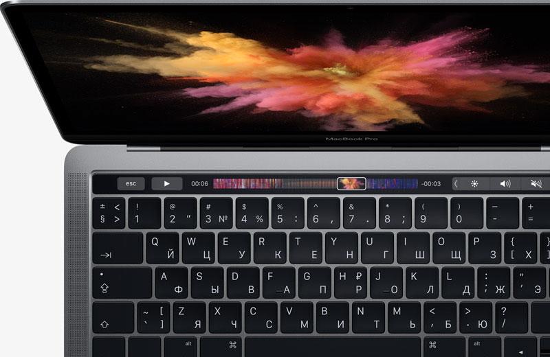 В рекламе главный акцент сделан на тач-панели Touch Bar, которая заняла место верхнего ряда клавиш клавиатуры. На нее могут выводиться органы управления операционной системой или отдельными приложениями: кнопки, панели, слайдеры, смайлки и прочее. Кроме того, в Touch Bar встроена система идентификации по отпечатку пальца Touch ID. С ее помощью можно оплачивать покупки и быстро переключать аккаунты пользователей.