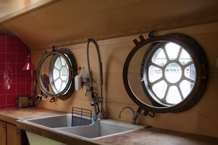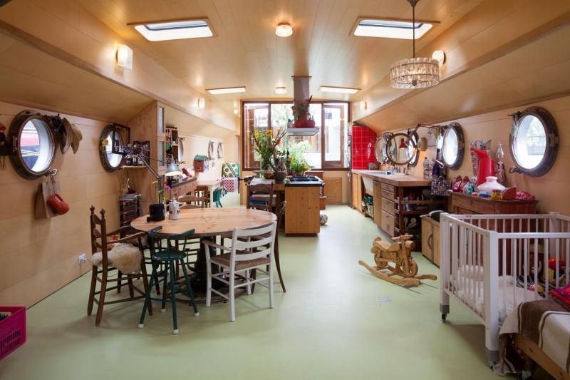 Благодаря хорошему состояние внутренних отсеков удалось совершить кардинальный редизайн внутреннего пространства без каких-либо вмешательств в судоходный механизм. Основная часть отделочных работ проводилась в грузовом трюме, размеры которого составляют 5 на 30 метров, а высота потолков — 3,2 м. Лодка оснащена 18 окнами-иллюминаторами, поэтому внутри довольно светло, просторно и по-домашнему уютно.