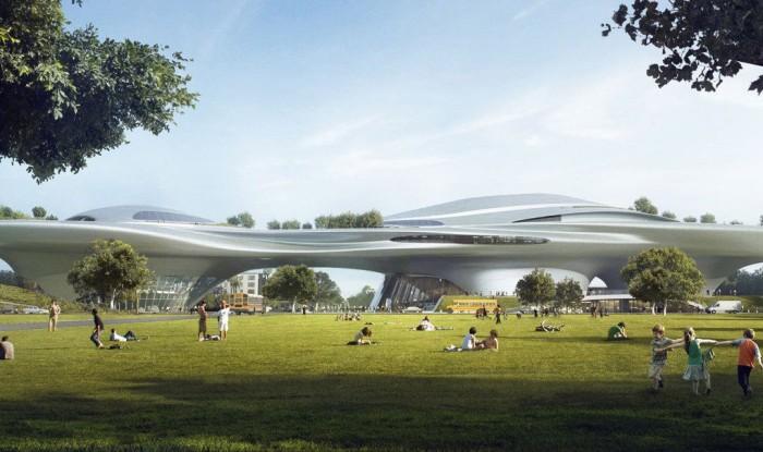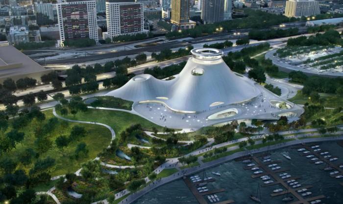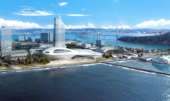 Ведущий архитектор фирмы MAD Ma Yansong представил два новых проекта Музея нарративного искусства, которые могут быть построены в Лос-Анджелесе или Сан-Франциско. Конструкция, которая предлагается для Сан-Франциско, должна быть расположена на Treasure Island – искусственном острове в заливе Сан-Франциско. Обтекаемая клиновидная структура будет установлена на вертикальных опорах. Такое расположение позволит интегрировать музей на территорию набережной, не лишая при этом жителей и гостей города важных локаций для отдыха.