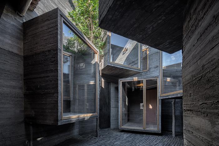 Само строение сделано из темного бетона с дизайном в виде досок. Чтобы пространства не казались такими уж мрачными, в каждой из комнат установлено окно от пола до потолка. Удивительно, но практически все окна выходят во двор, и только малая часть устремлена в небо. Постояльцы смогут, наверное, даже наблюдать друг за другом.