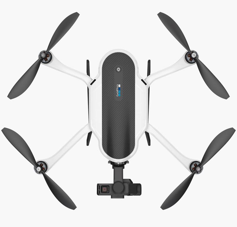 Компактный дрон GoPro Karma имеет складную конструкцию. Он оснащён четырьмя винтами и специальным съёмным стабилизатором для крепления камеры GoPro. В комплект поставки входит пульт дистанционного управления с сенсорным дисплеем.