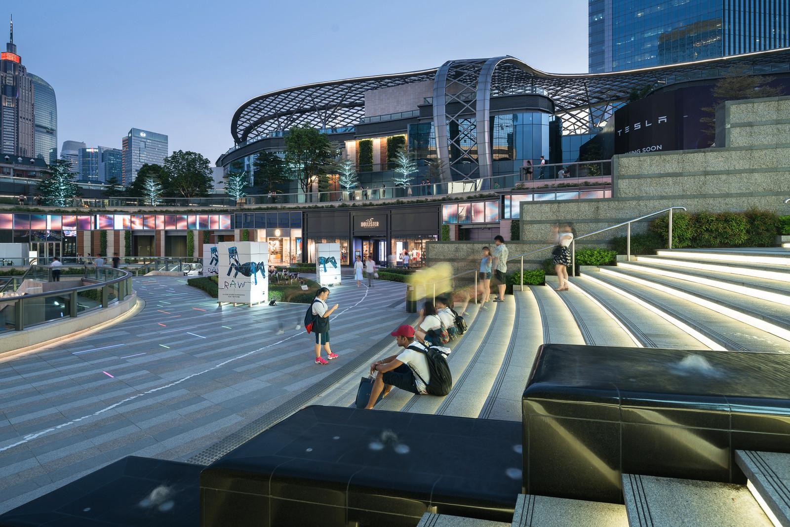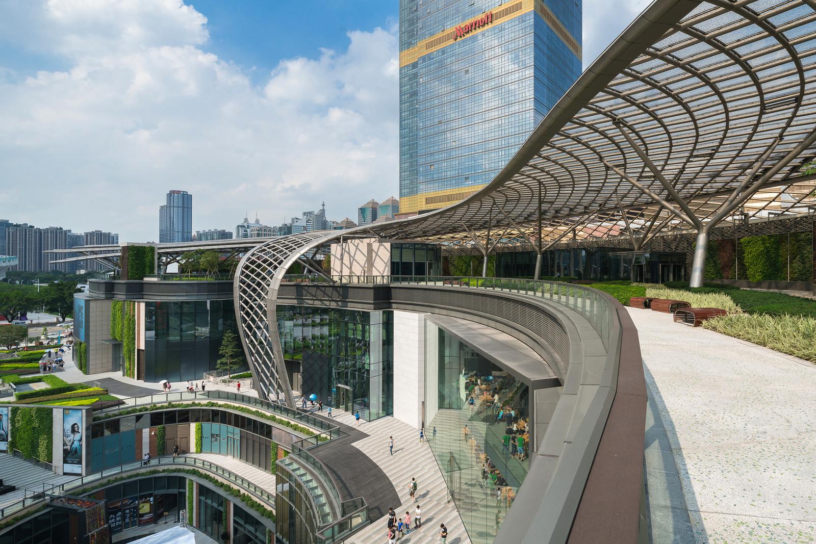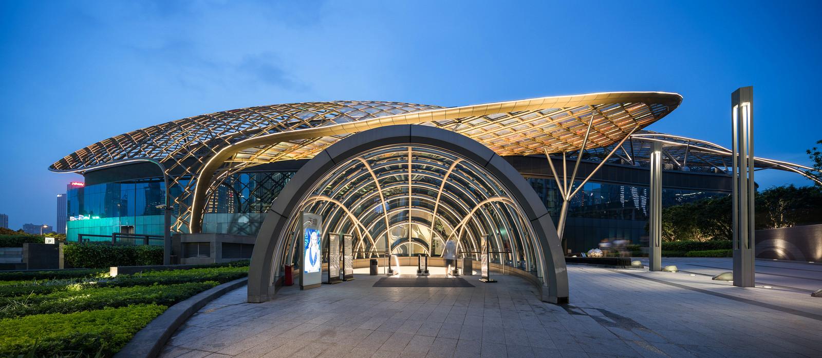 Стальная монококовая конструкция крыши имеет форму иероглифа, отсылающего к знаку «Двойной рыбы» и обозначающего гармонию и удачу. Динамичные интерьеры комплекса сформированы текучим форма сводчатых потолков и непрерывными лентами аркад и переходов. Торговые зоны перемежаются большими атриумами, обеспечивающими пространство естественным светом.