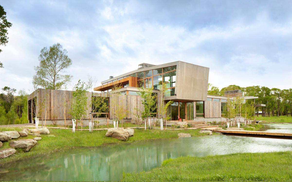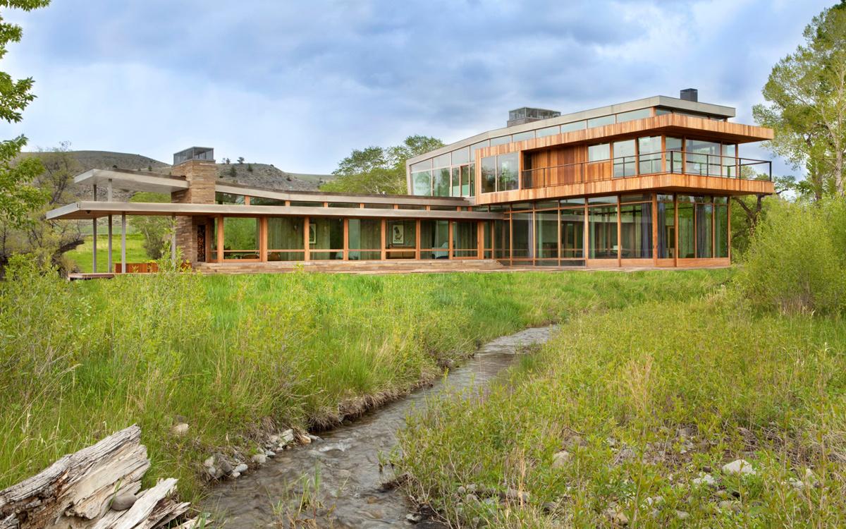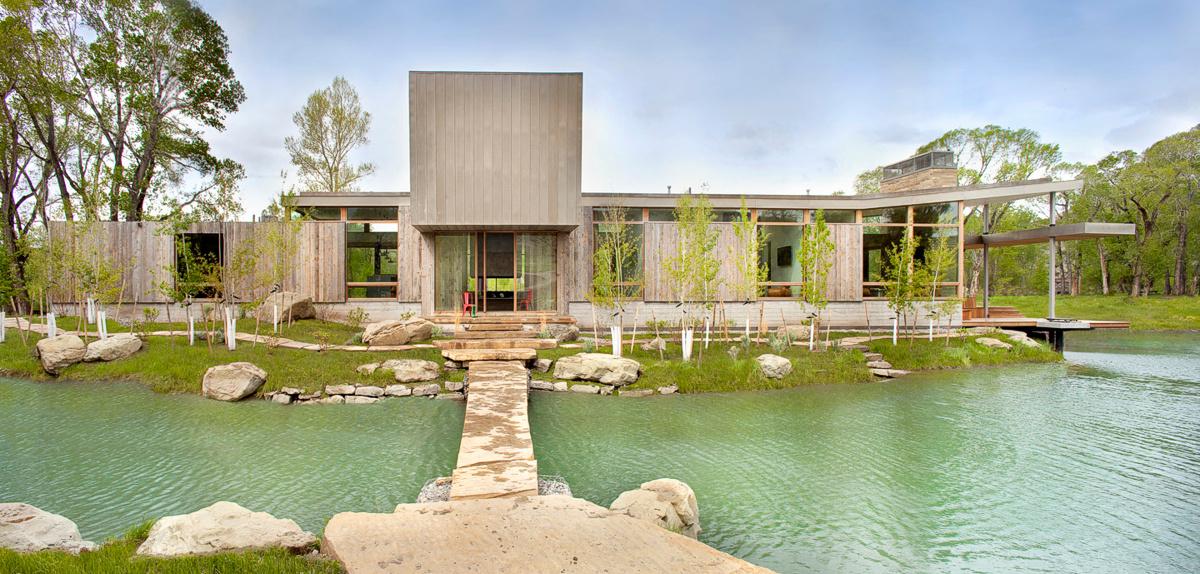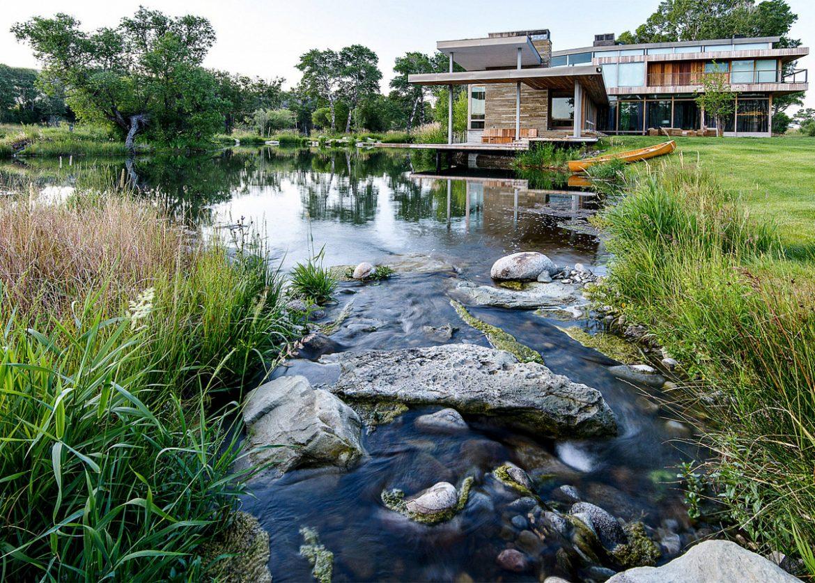 Дом под названием Watershed Lodge расположен на огромной территории площадью 809 гектаров прямо на берегу реки, которая весной выходит из берегов. Для того, чтобы защитить дом от затопления, архитекторы приподняли его на 72 сантиметра над уровнем земли, установив на специальный помост, который позволяет воде свободно течь под дом и вокруг него, не повреждая фундамент и стены. К главному входу ведет низкий мостик над рекой.
