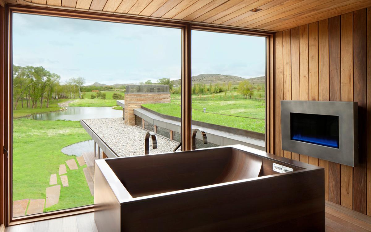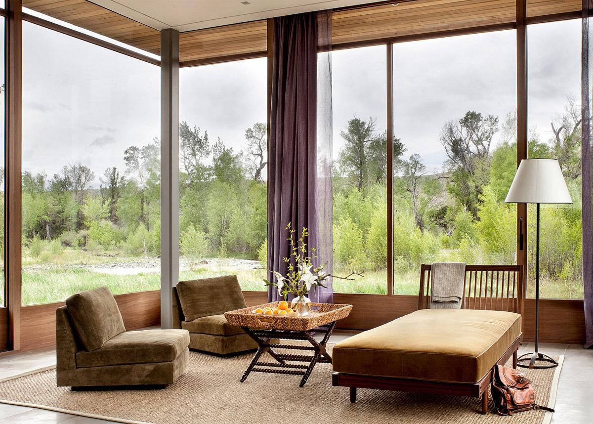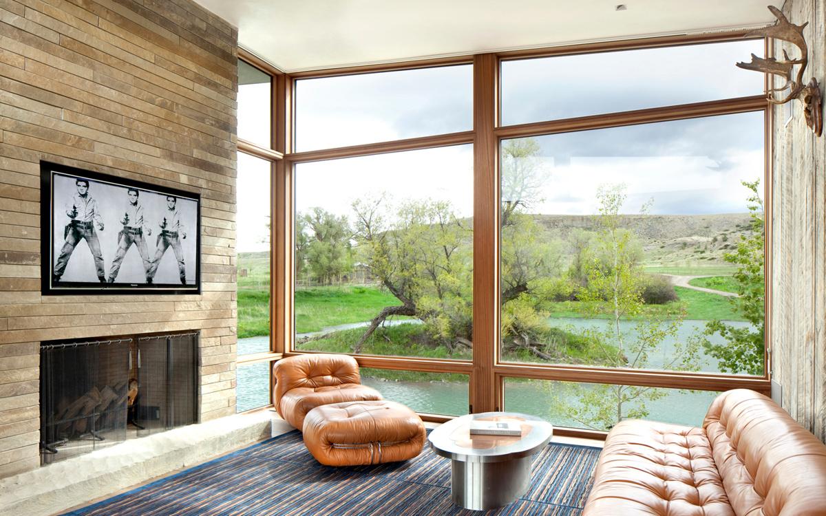 Дикая природа вокруг напоминает об американском западе столетней давности. С территории 353-метрового особняка открывается великолепный вид на горы. Грех было не воспользоваться этим преимуществом, так что большую часть стен сделали с панорамными окнами.