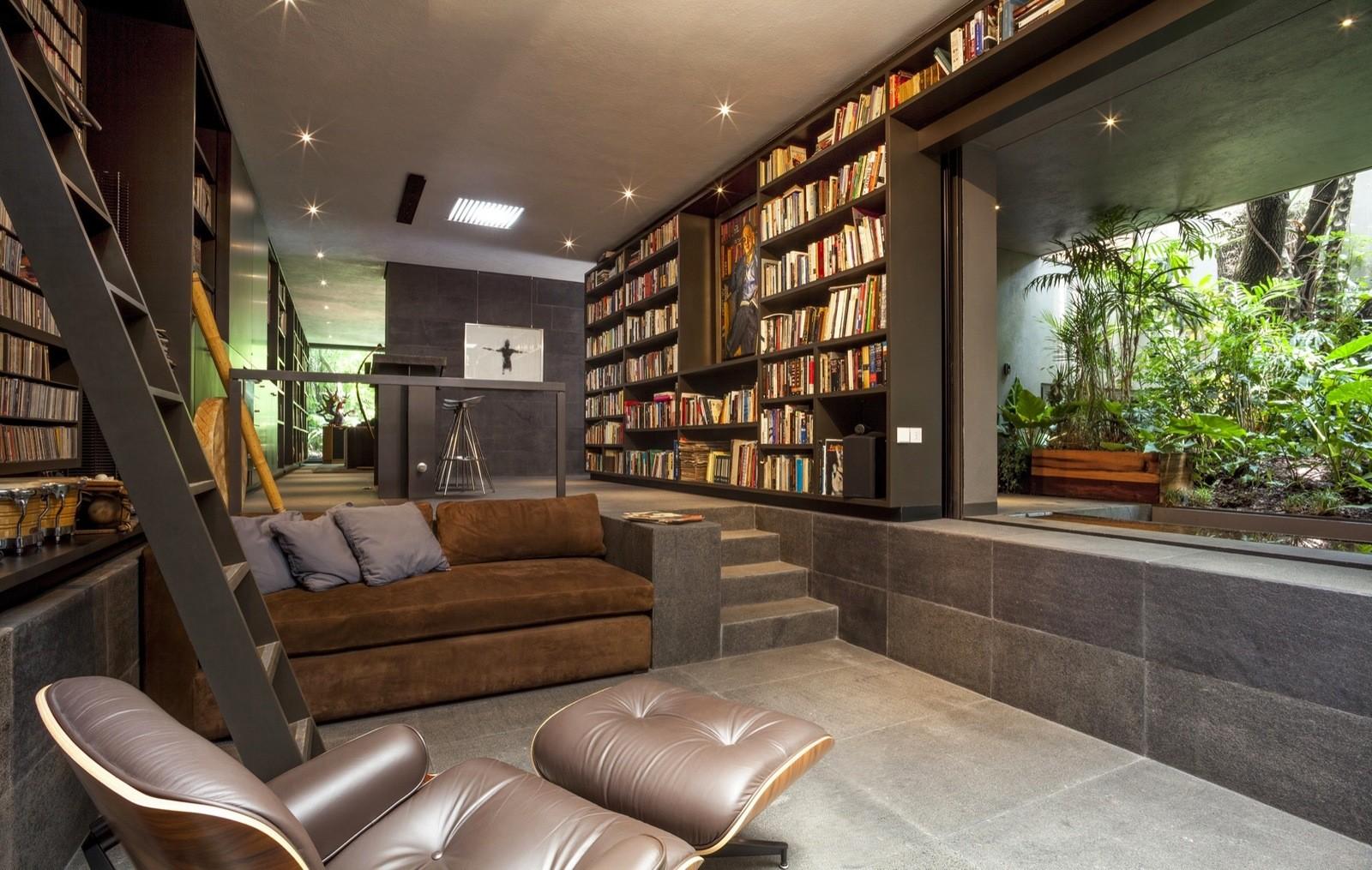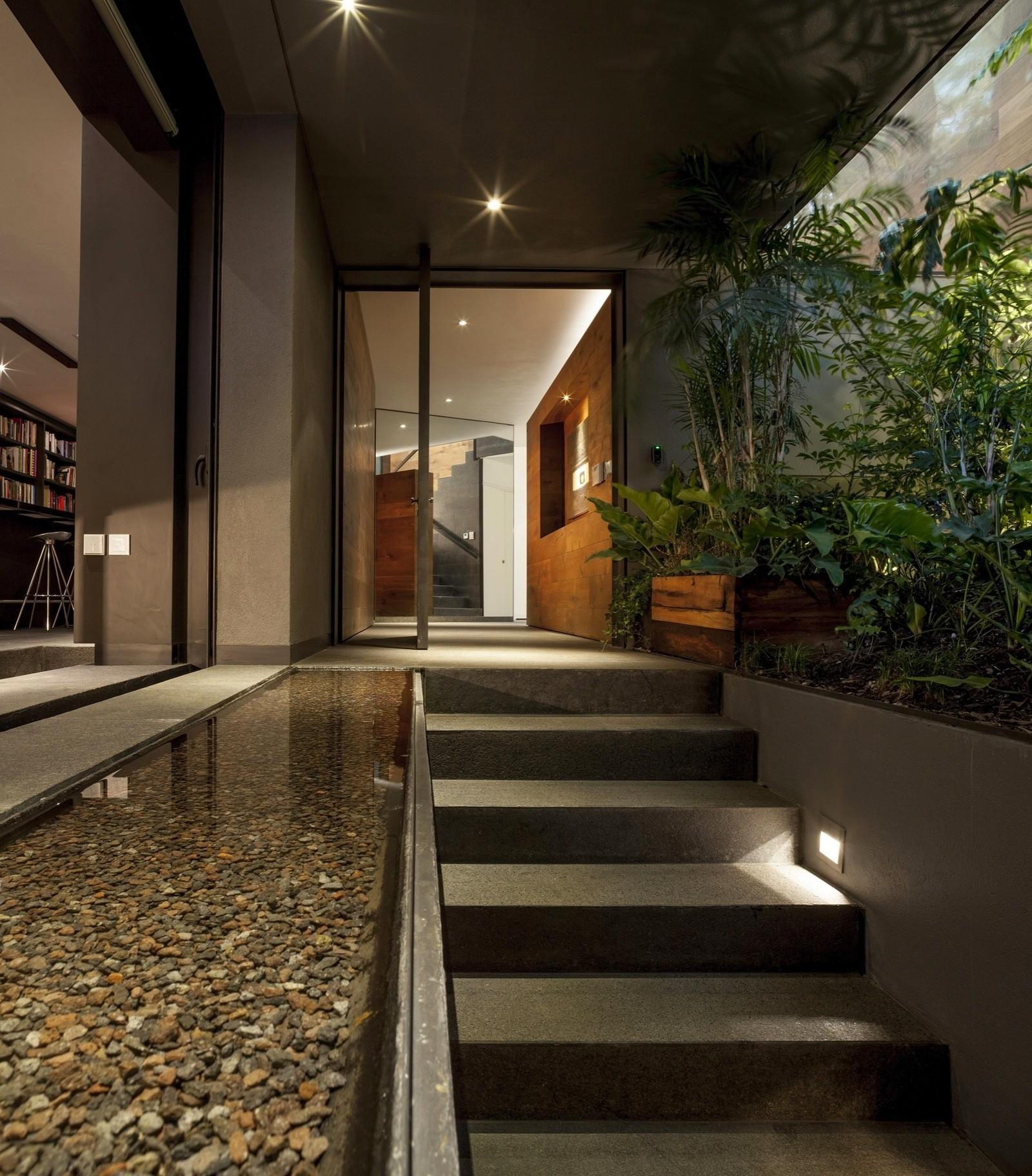 Использованные при строительстве природные материалы рождают богатую игру фактур и оттенков, что в сочетании с интегрированной в интерьер зеленью сада и продуманной системой освещения создаёт изысканную, но уютную атмосферу дома.