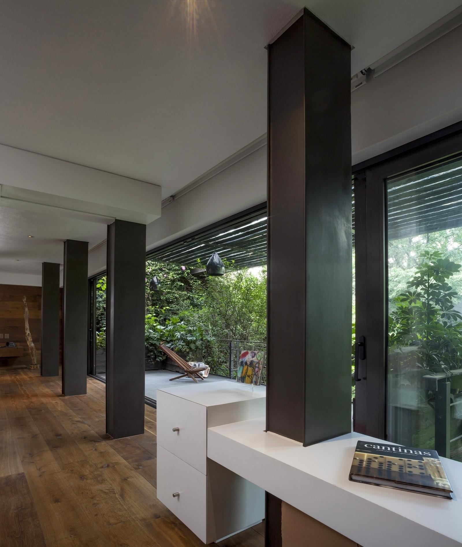 Архитектура дома разворачивается как интимный ландшафт, в котором различные локации соединены друг с другом в стремлении достичь функциональности и гармонии с окружающей тропической зеленью. Особенностью оформления интерьеров являются облицованные деревом толстые стены, широкие проёмы в которых направляют взгляд в сторону сада и визуально впускают пышную растительность во внутреннее пространство дома.