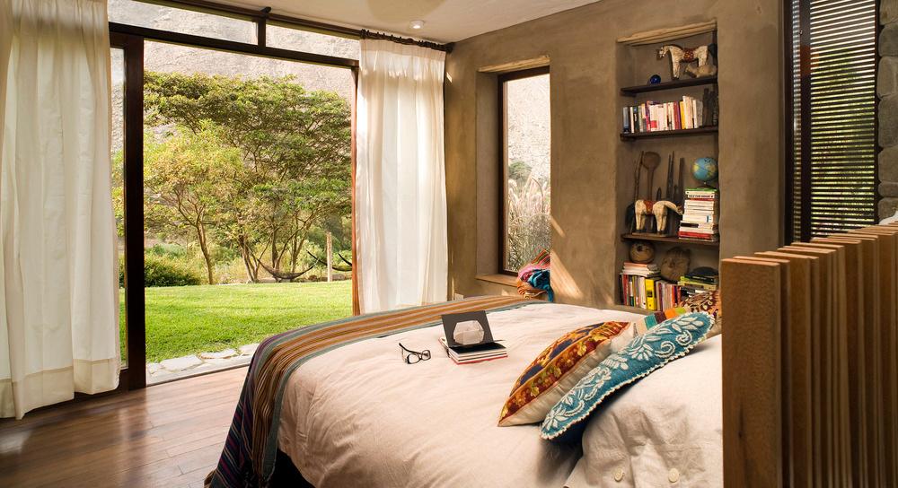 В большем по размеру доме находятся спальни для хозяев и гостей, и крытый дворик для совместных трапез на свежем воздухе. В меньшей постройке с окнами во всю стену располагается гостиная.