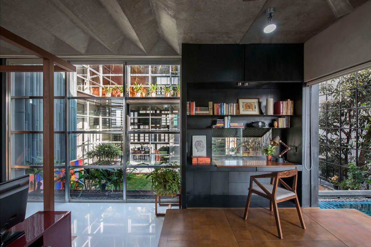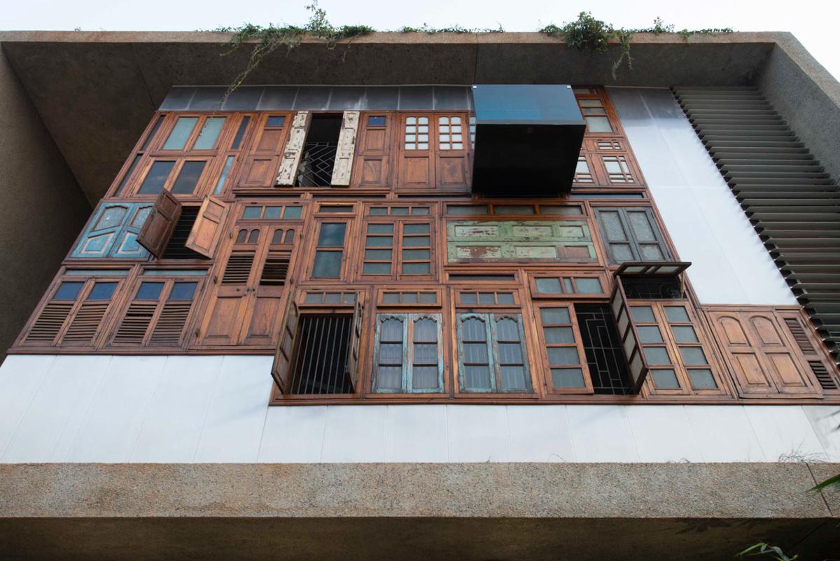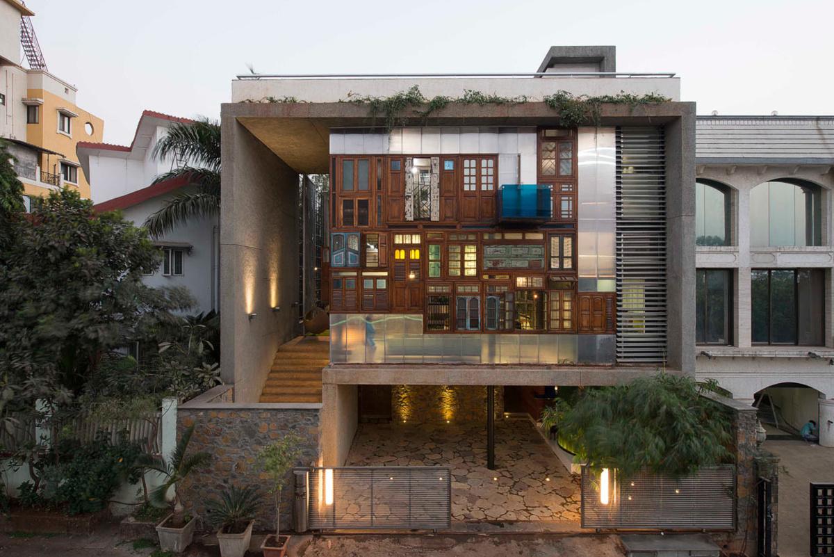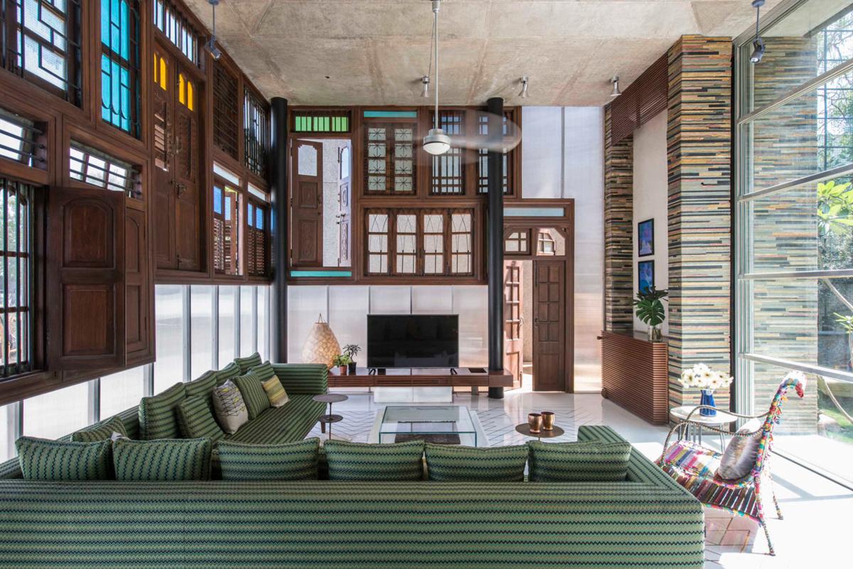 Частный дом расположен на холме в одном из богатых районов легендарного Бомбея. Ностальгические элементы, которые собирали по всему городу, утоплены в прочную бетонную окантовку. Внутри они формируют уникальную атмосферу гостиной, разделяя рифленый бетонный потолок и белый мраморный пол, инкрустированный медью. Одни из окон открываются, другие —декорированы цветным стеклом.