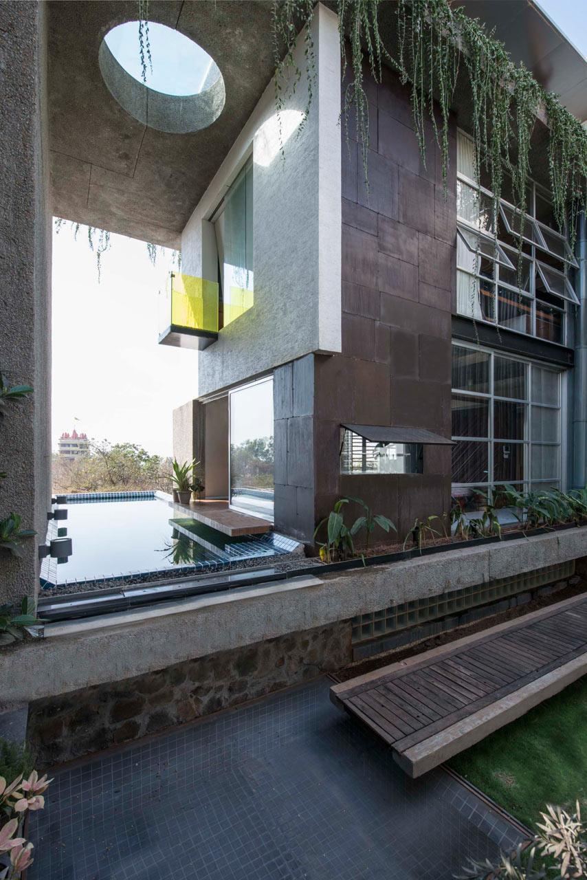 Еще одна из стен обшита остатками металлических пластин. У этой же стены расположили бассейн под навесом, в который можно попасть прямо из гостиной. В сезон дождей бассейн служит водным резервуаром, так как к нему ведут стоки.
