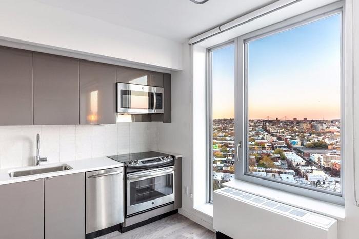 Модули были доставлены на стройплощадку уже в комплекте с кухонными гарнитурами и бытовой техникой. Лишь деревянный пол настилался на месте. Крупногабаритные бескаркасные окна открывают вид на Бруклин и Манхэттен.