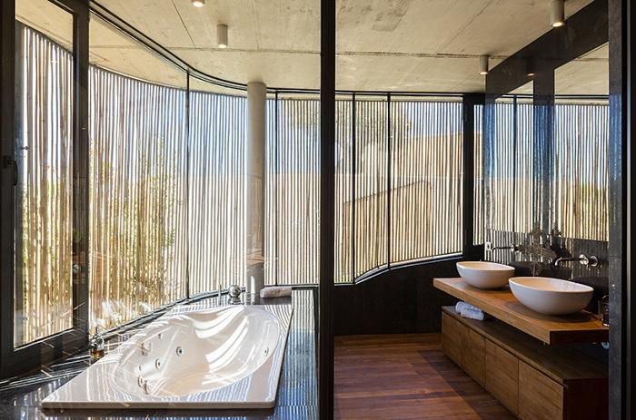 Особое внимание архитекторы уделили гармоничной интеграции резиденции в окружающую среду. Непрерывная связь с природой становится реальной за счет использования больших окон, стирающих границы между внутренним и наружным пространствами. Если же хозяева пожелают оказаться в более приватной обстановке, то оконные проемы можно закрыть специально разработанными навесами и решетчатыми бамбуковыми жалюзи.