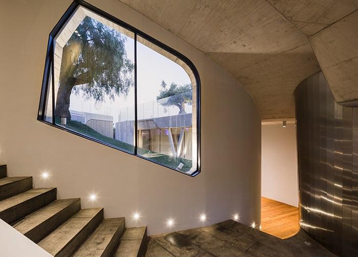 Сама резиденция состоит из трех уровней, интегрированных в склон. Внутренний дворик переплетается многочисленными дорожками, бассейнами и террасами. На самом верхней этаже расположена гостиная, средний уровень занимают кухня, столовая и тренажерный зал, а в самом низу обстроено шесть жилых комнат.