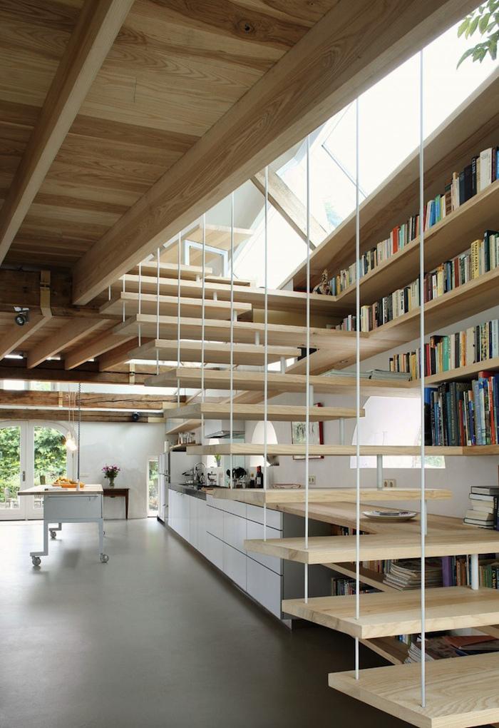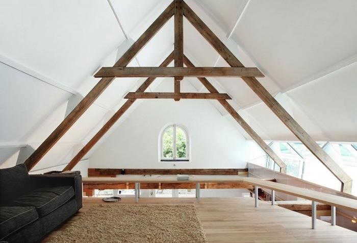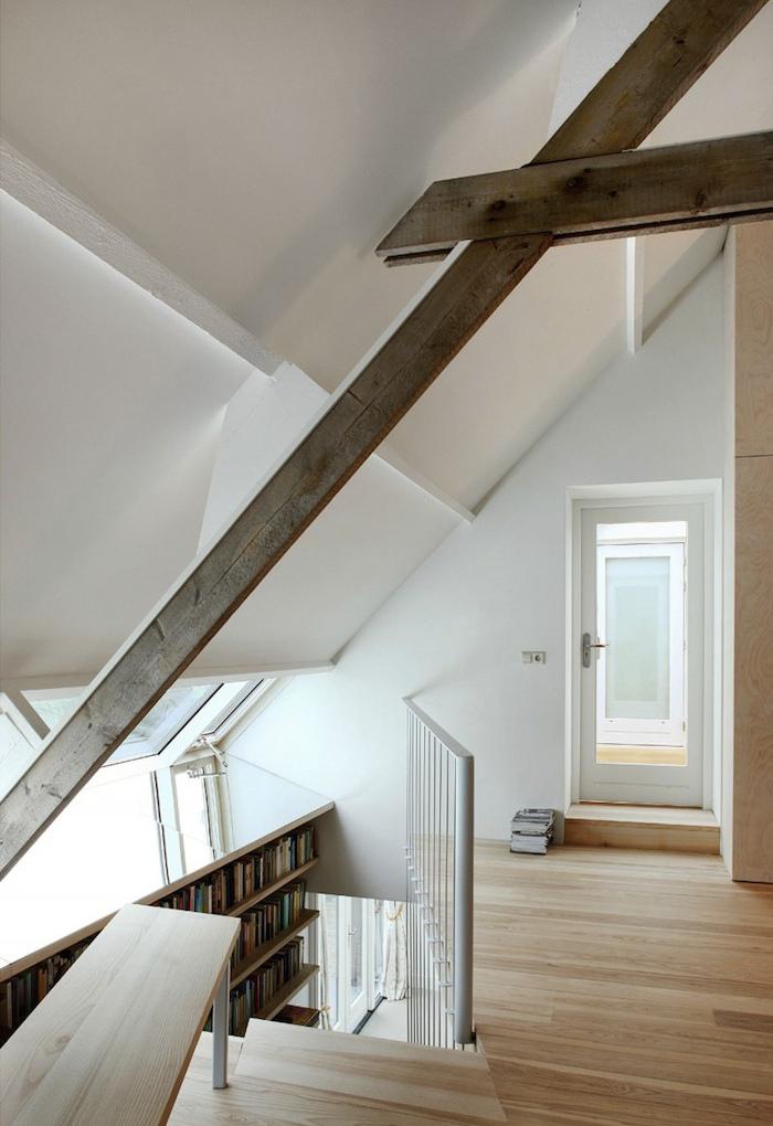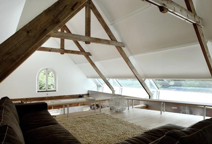 Maxwan architects + urbanists занялись перепланировкой. Общую высоту потолков в 10 метров распределили между двумя уровнями. На первом этаже сделали масштабные окна, чередующиеся с небольшими арочными отверстиями. Между крышей и фасадом появился стеклянный разъем, который помог осветить второй этаж.
