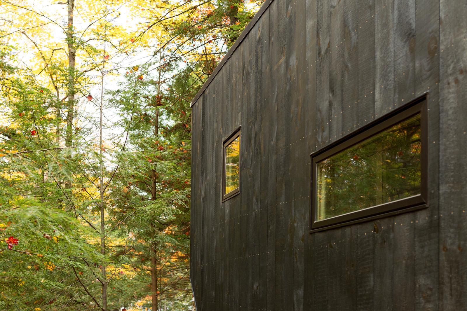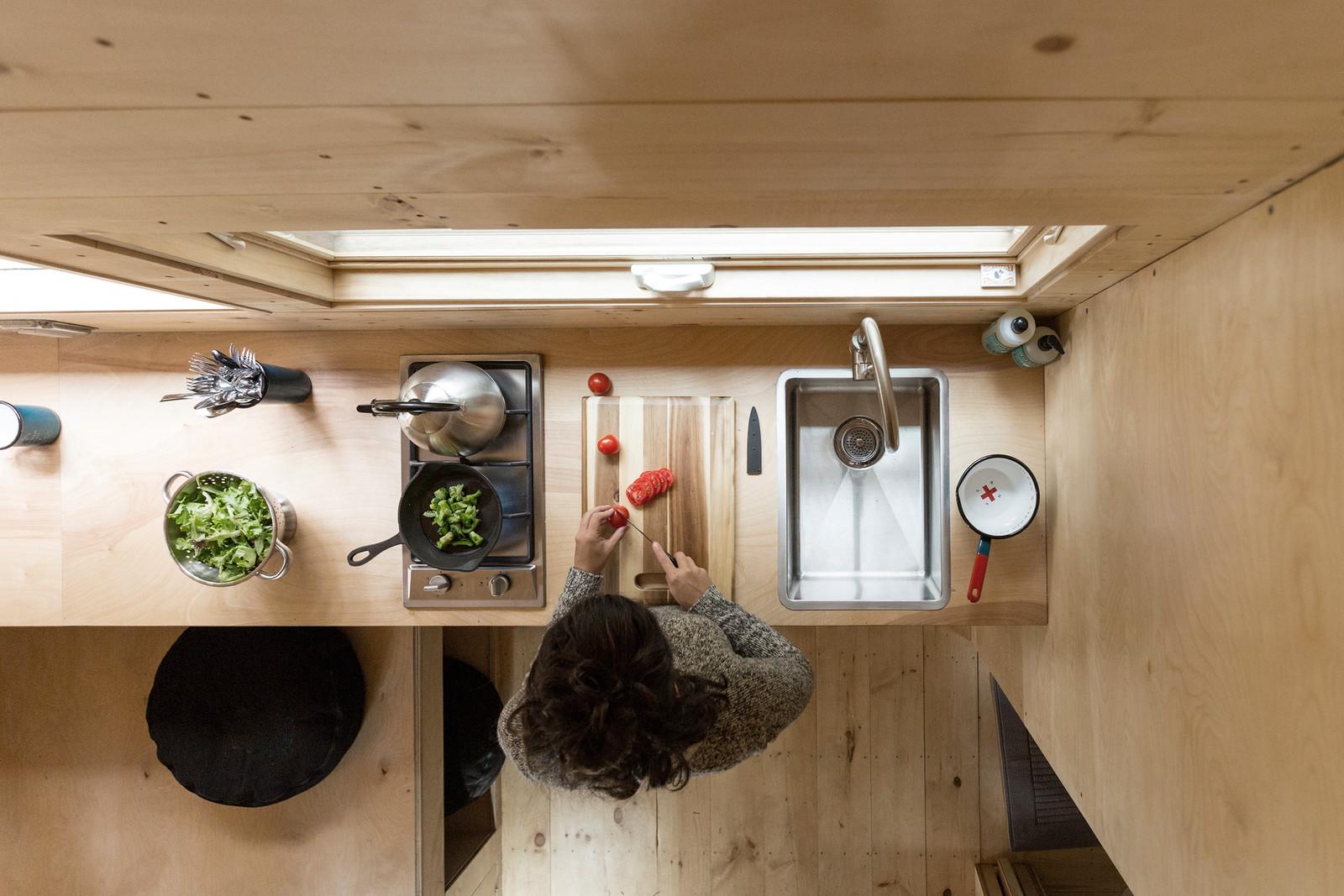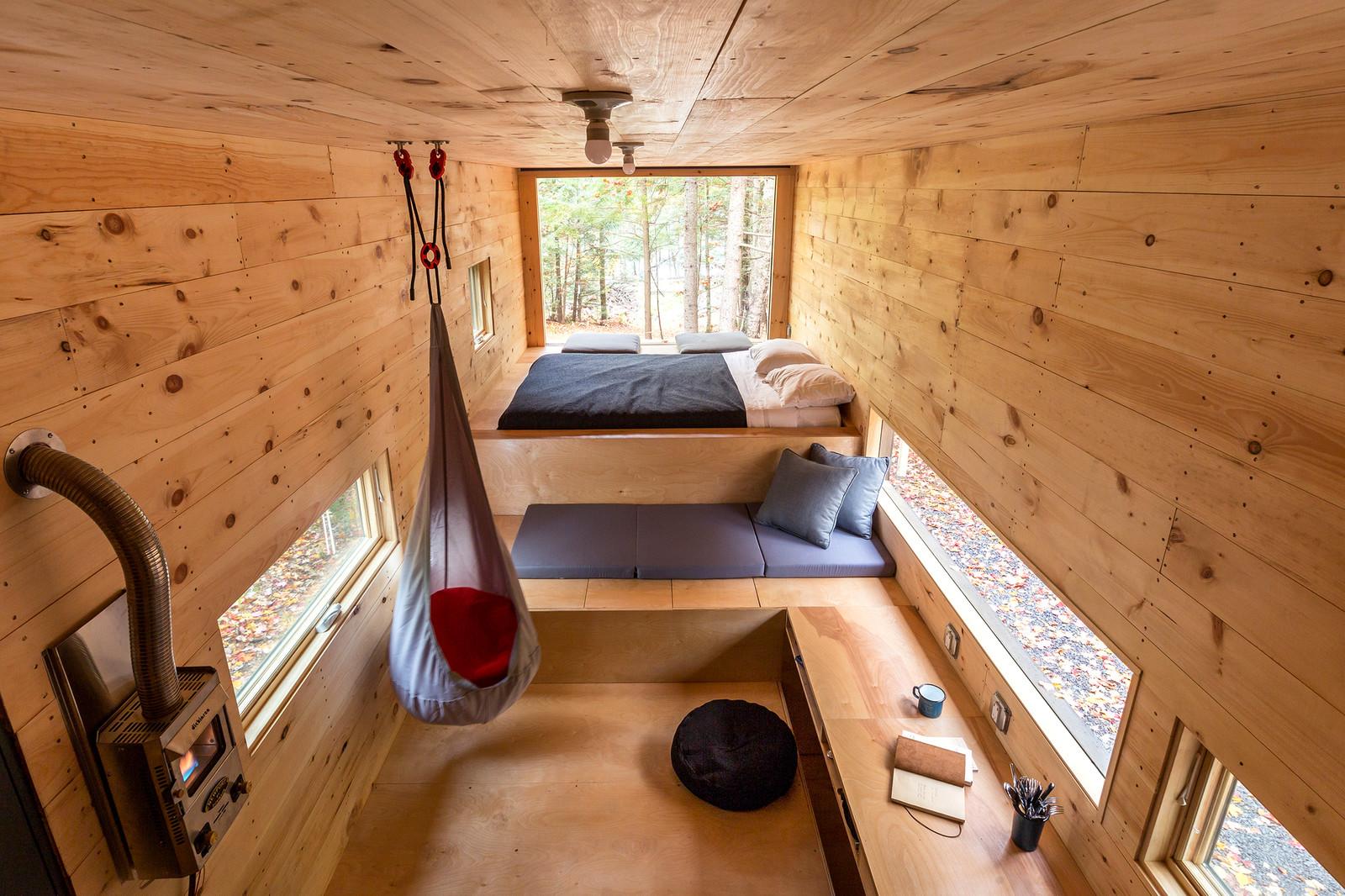 Вагончик площадью 15 квадратных метров, установленный в лесу недалеко от Бостона, США, задуман как гибкое жильё с многофункциональным внутренним пространством. Интерьер включает в себя нескольких уровней, каждый из которых наделён некоторой функциональной заданностью, но не вполне определённой, и способ их использования зависит от желания человека. Так, поверхность для сидения становится спальным местом или зоной для еды, или даже платформой, по которой ходят.