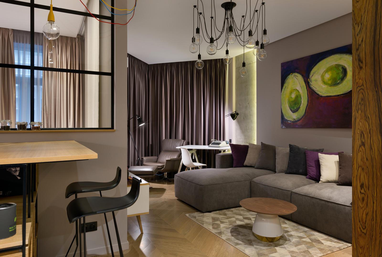 Несмотря на небольшие габариты, в квартире удалось разместить все основные функциональные зоны. Прихожая, гостиная и кухня в целях экономии пространства совмещены, зонирование происходит благодаря различным отделкам пола и с помощью барной стойки. При планировании кухни было решено осветить её естественным светом, добавив окно в смежную со спальной комнатой перегородку, которое при необходимости закрывается шторой. В эркере разместились рабочая зона и большое кресло, что нисколько не стеснило мягкую часть гостиной.