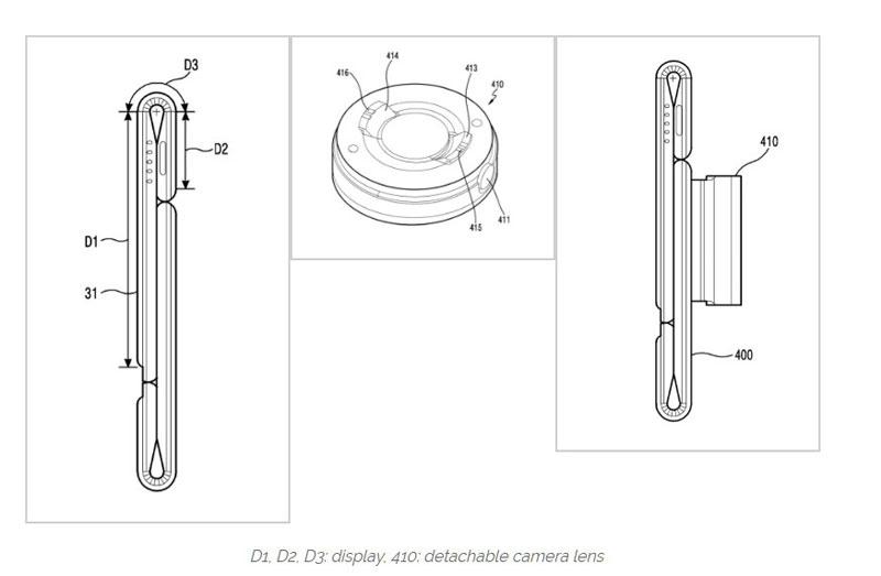 Судя по схематичным изображениям, в гибком смартфоне Samsung предусмотрено два шарнира и съёмный объектив камеры с кнопкой «Домой». Камера поддерживает возможность присоединения внешней оптики с разными опциями, в том числе с оптической стабилизацией и оптическим зумом. Дополнительный объектив сильно выступает из корпуса, а в отсоединённом положении хранится в чехле или в кармане пользователя.