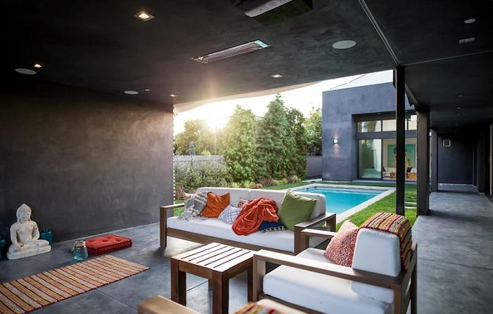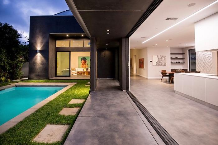 Лаконичный интерьер отлично уравновешивает интенсивный фасад дома. Дизайн выполнен в монохромных оттенках. Огромные раздвижные стеклянные двери буквально стирают границы между внутренним пространством и окружающим ландшафтом.