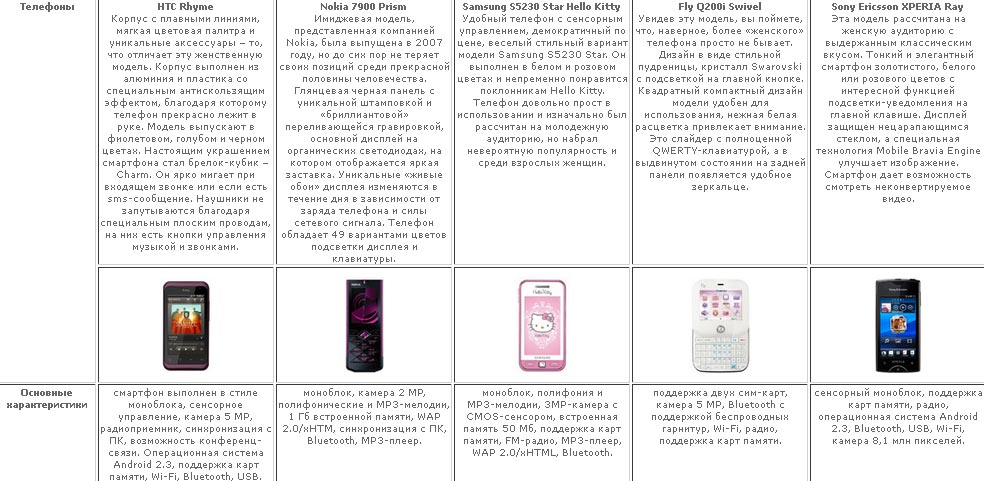 Производители давно поняли, что дамы предпочитают телефоны, которые выделяются среди других, и каждый год представляют новые интересные варианты. Выбор достаточно большой: и для тех, кто предпочитает умные телефоны с множеством функций, и для тех, кого не интересуют дополнительные возможности.