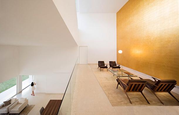Дом состоит из двух двусветных объемов, соединенных между собой по диагонали. Солнечный свет попадает в дом сквозь широкое длинное окно на верхнем уровне и отражается от позолоченной стены. Таким образом дом заполняет золотой свет, как того хотел архитектор.