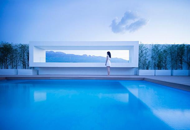 На цокольном этаже дома расположились общие комнаты, через которые можно пройти в сад. Второй этаж занимают спальни, а на третьем уровне – крыше дома – разместился бассейн и еще несколько личных комнат.