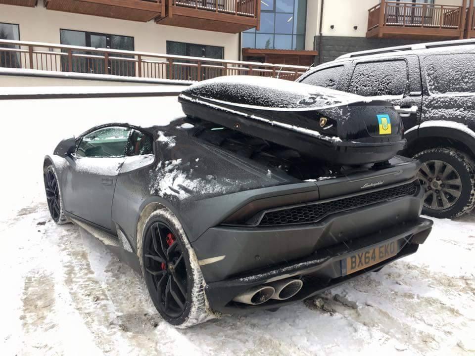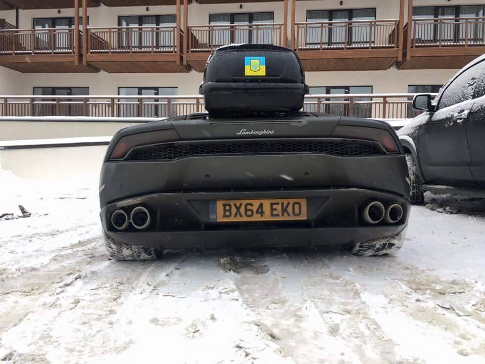 Картина, как говорится, маслом: на фото у заснеженных гор стоит матовый Lamborghini с обтекаемым багажником на крыше, украинской символикой. При этом номера на машине – британские.